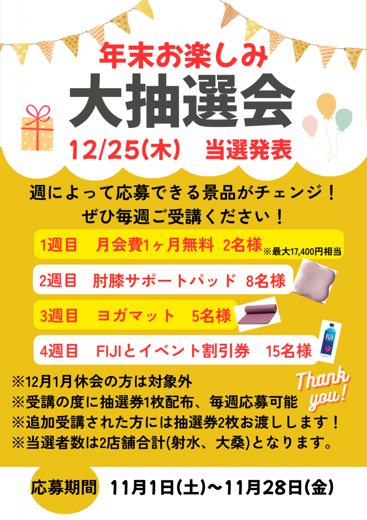 実施期間中、レッスンを受講するごとに抽選券1枚配布、1人何枚でも応募できます✨