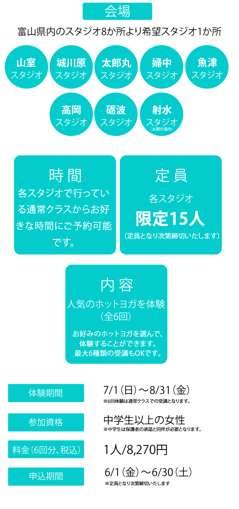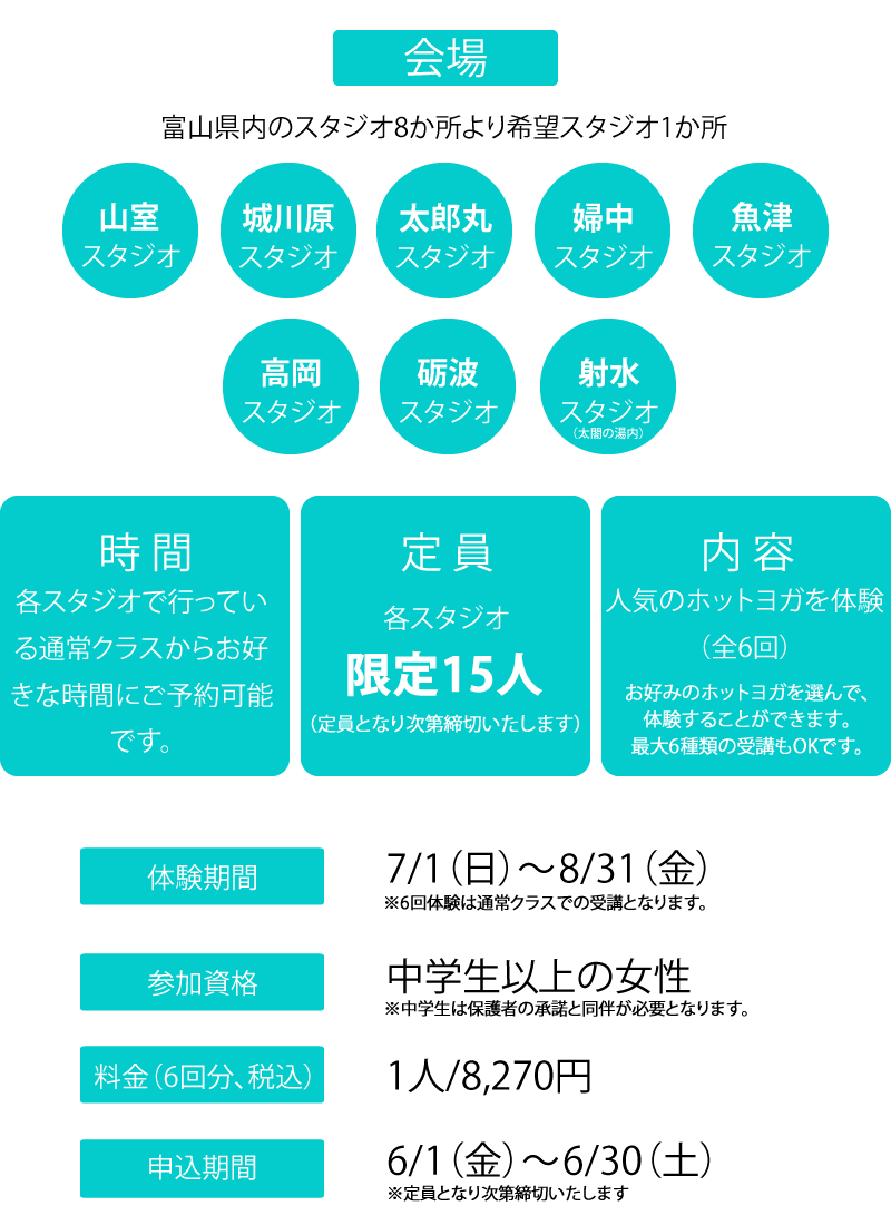 お好きな時間に県内8か所のお好きなスタジオでホットヨガが体験できます!